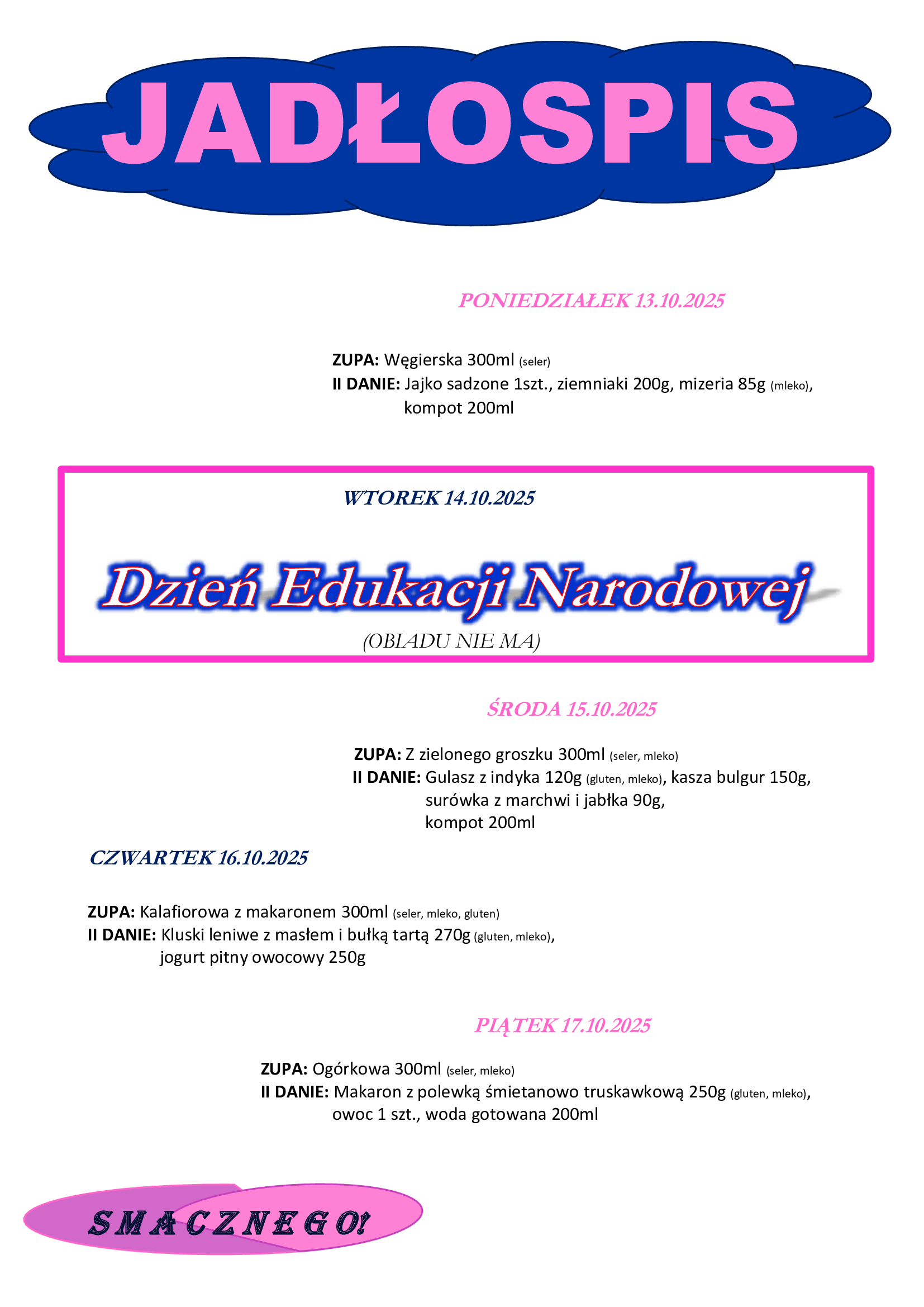 OBIADY WYDAWANE BĘDĄ od poniedziałku 8.09.2025 r.