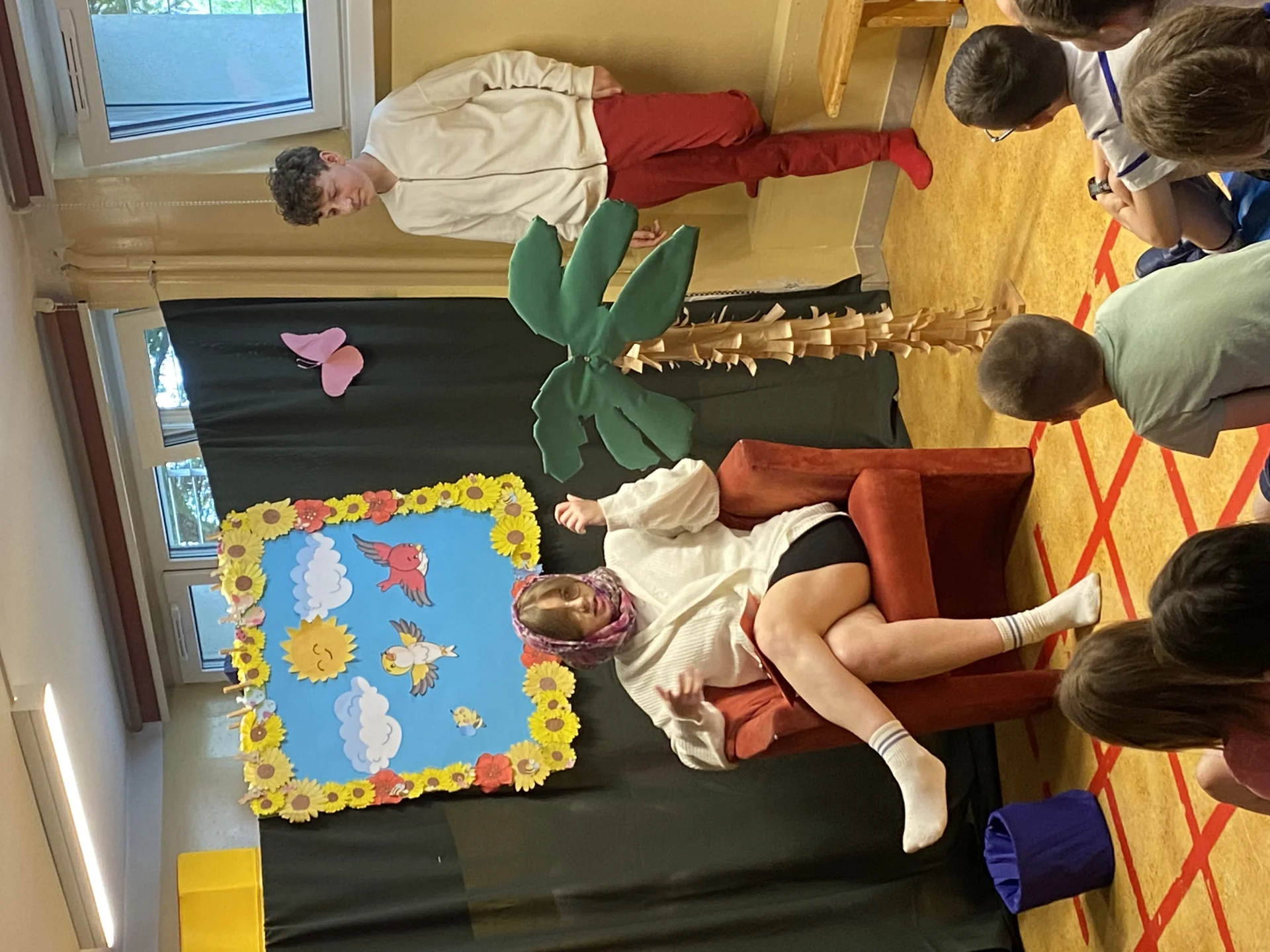6 czerwca 2025r. uczniowie klasy 8b zaprezentowali kolegom i koleżankom z klas drugich przedstawienie kukiełkowe z wykorzystaniem utworów Wandy Chotomskiej. Podczas spektaklu panowała fantastyczna atmosfera, a nasi najmłodsi z wielkim zainteresowaniem śledzili losy bohaterów wierszy.