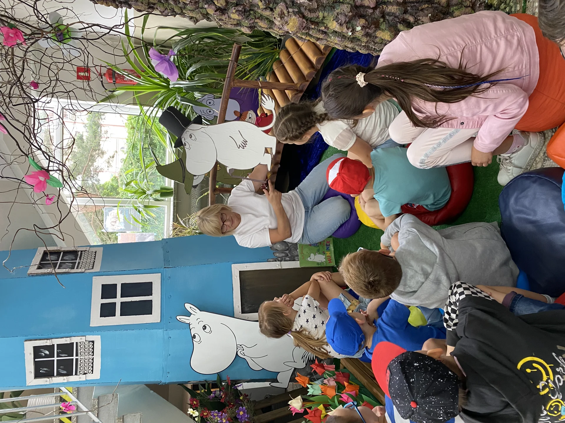 Dzieci wysłuchały opowieści z życia Muminków i ich przyjaciół z Doliny. Poznały po krótce historię nietuzinkowych bohaterów, jak: Paszczak, Włóczykij i Mała Mi. Następnie pierwszoklasiści pokolorowali i ozdobili postaci z Doliny Muminków.