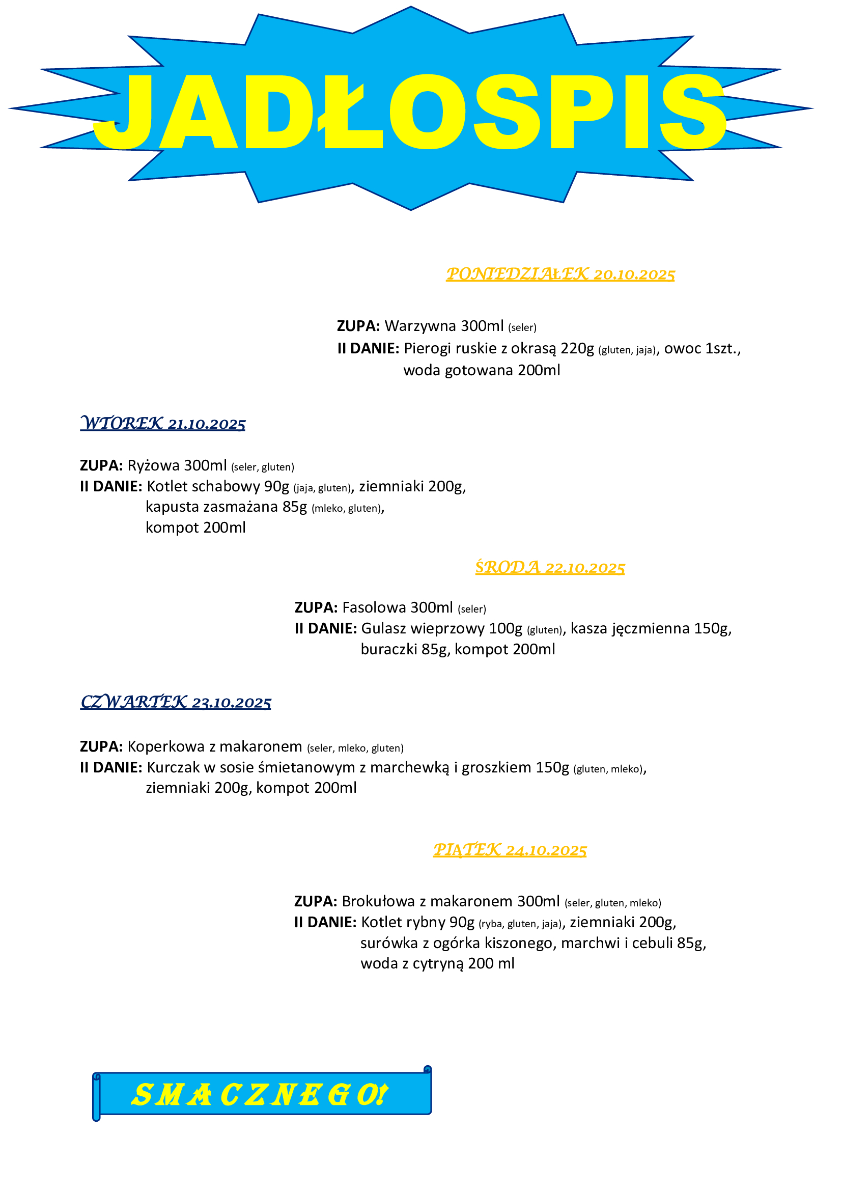 Jadłospis na tydzień 20-24.10.2025 r.