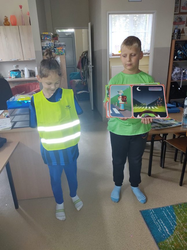 W świetlicy szkolnej odbyło się spotkanie z panią policjantką, która przypomniała dzieciom zasady bezpiecznego poruszania się po drodze. Uczniowie dowiedzieli się, jak ważne jest noszenie odblasków, szczególnie jesienią i zimą. Na zakończenie każde dziecko otrzymało odblask.