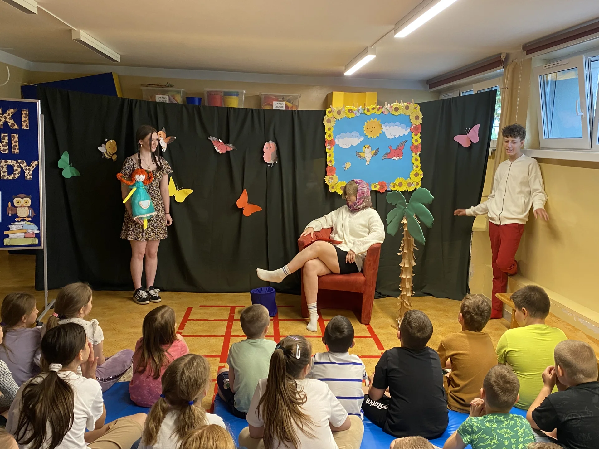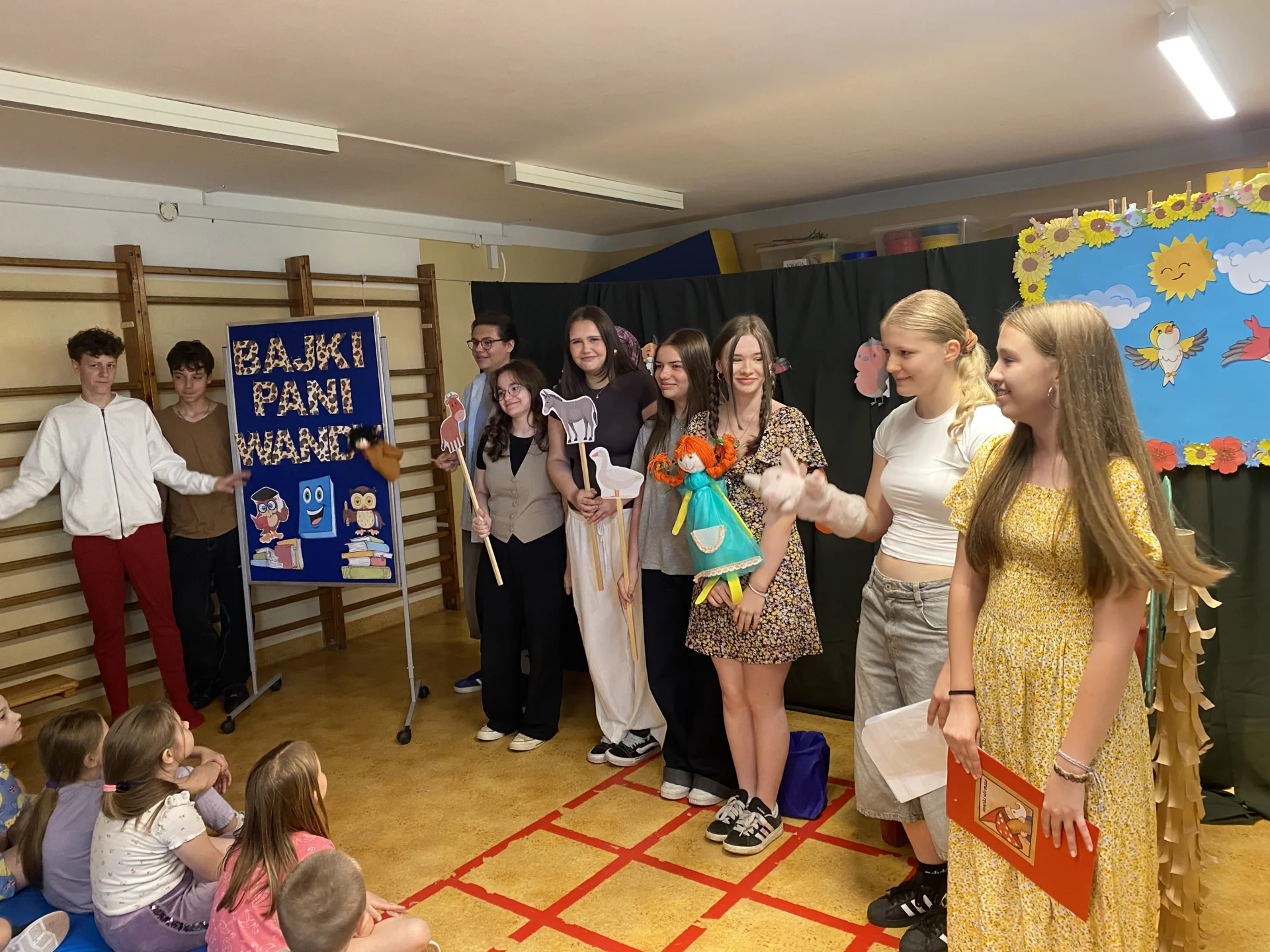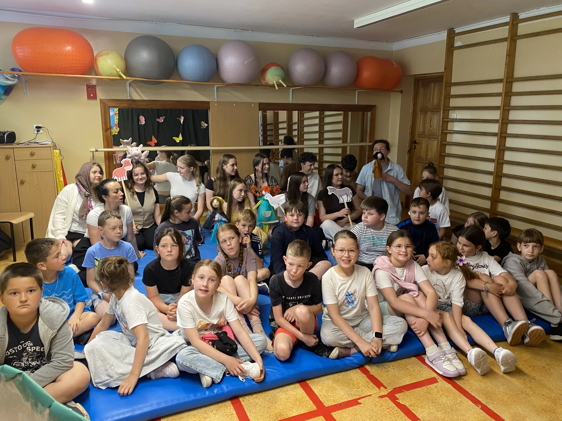 6 czerwca 2025r. uczniowie klasy 8b zaprezentowali kolegom i koleżankom z klas drugich przedstawienie kukiełkowe z wykorzystaniem utworów Wandy Chotomskiej. Podczas spektaklu panowała fantastyczna atmosfera, a nasi najmłodsi z wielkim zainteresowaniem śledzili losy bohaterów wierszy.