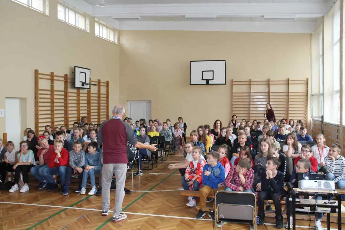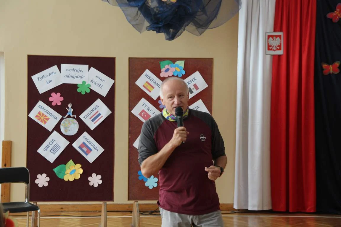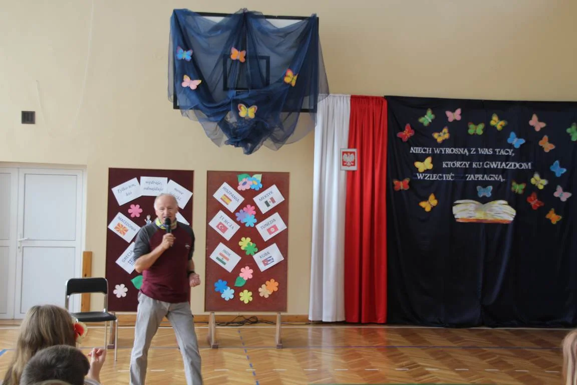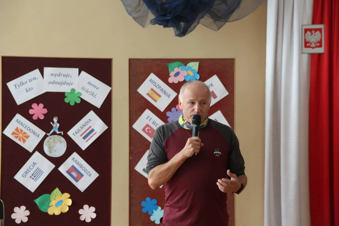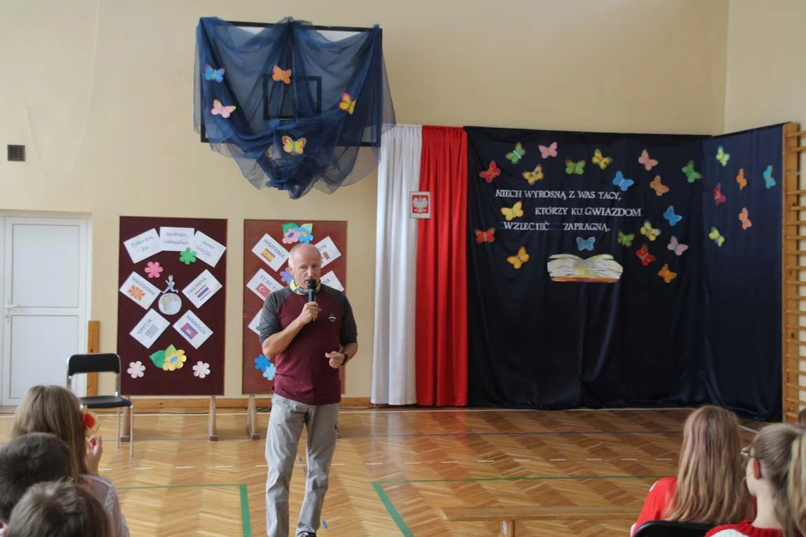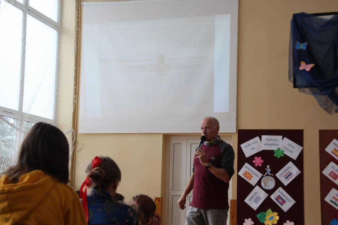 Niezwykły dzień uświetniło przybycie Pana Pawła Hofmana, zapalonego biegacza i globtrotera. Podczas spotkania z uczniami zaproszony gość opowiadał o swej sportowej pasji i biegowych podróżach.