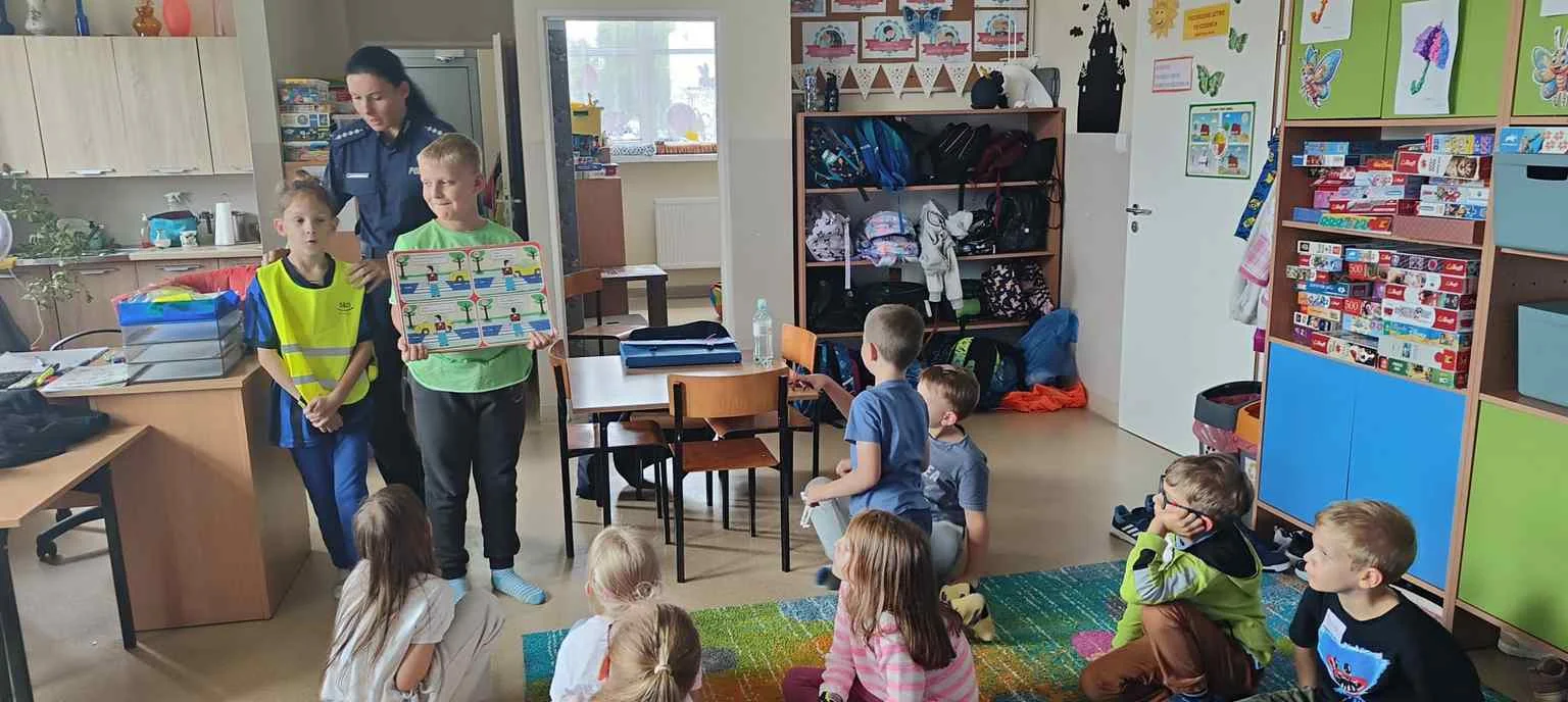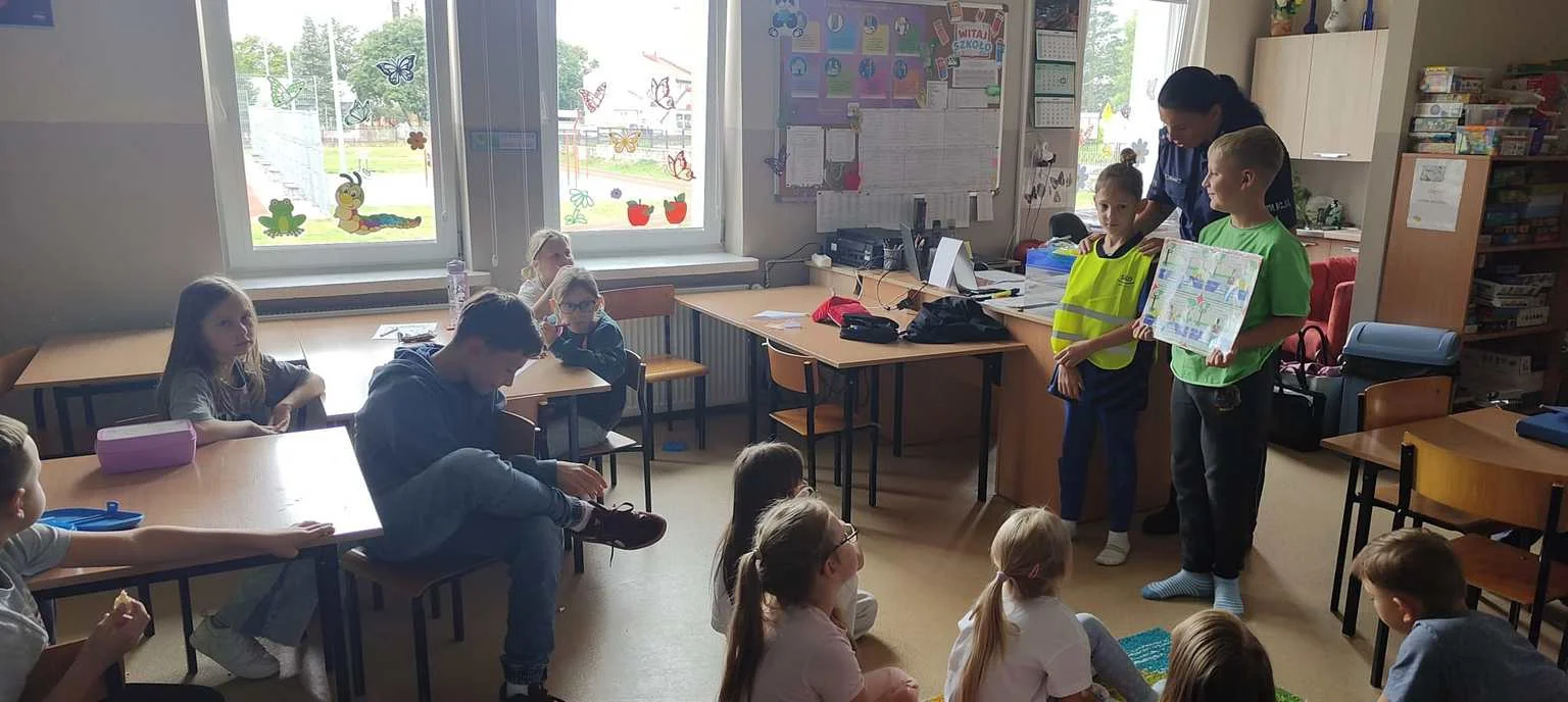 W świetlicy szkolnej odbyło się spotkanie z panią policjantką, która przypomniała dzieciom zasady bezpiecznego poruszania się po drodze. Uczniowie dowiedzieli się, jak ważne jest noszenie odblasków, szczególnie jesienią i zimą. Na zakończenie każde dziecko otrzymało odblask.