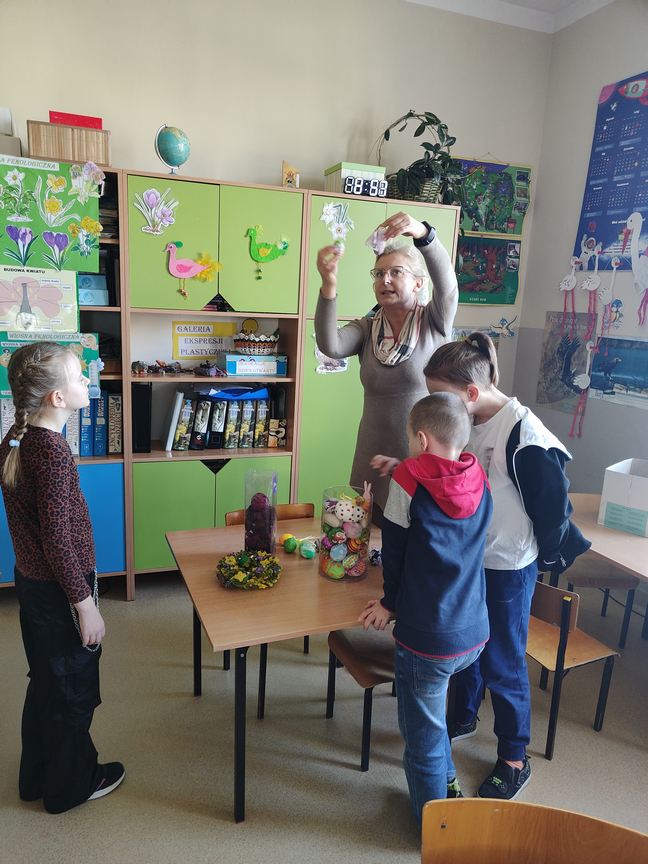 W wiosennym anturażu sali stopniowo przygotowujemy się do świąt. Dzieci poznały różne rodzaje pisanek, kraszanek, faberge- najdroższych biżuteryjnych jaj. Film i wystawa prac urozmaiciły zajęcia. Ćwiczenia plastyki dłoni wyczarowały w masie modelującej formy jajek z wytłoczonymi zajączkami, potem były kolorowane po wyschnięciu.